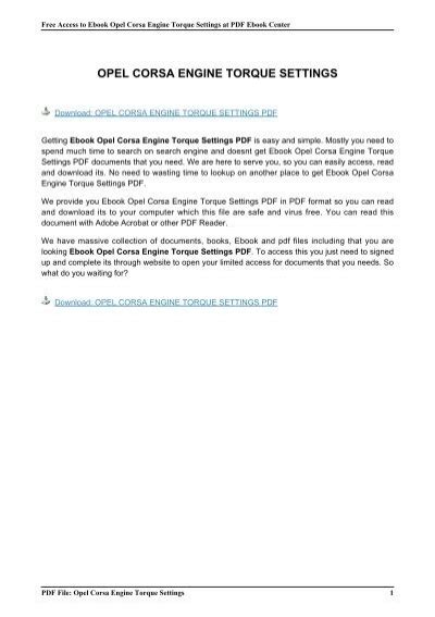 Read Online opel corsa engine torque settings PDF online is a convenient and frugal way to read opel corsa engine torque settings you love right from the comfort of your own home. Yes, there sites where you can get PDF "for free" but the ones listed below are clean from viruses and completely legal to use.